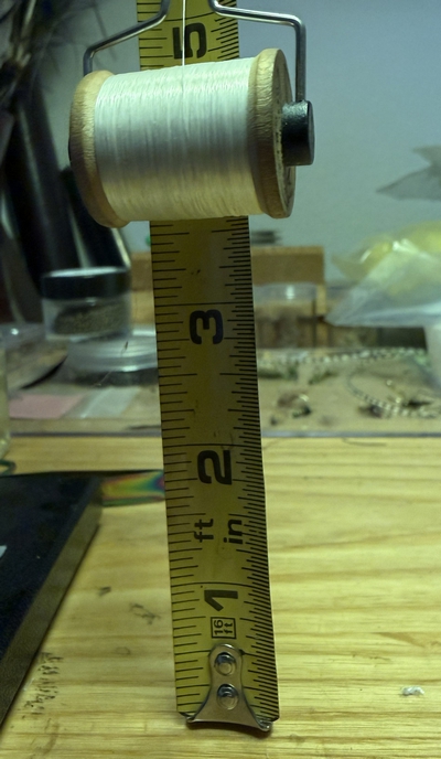Example: To rotate on the ribbing, I have to throw a half hitch or two on the fly, then swing the bobbin arm out to rest my bobbin on (a ten inch wide swath across the worksurface of my bench), clean up the head cement the bobbin arm just knocked onto my Grizzly neck, swear profusely, feed five turns of gold wire, then recover my bobbin from the arm, swing the arm out of the way, and tie off the wire.