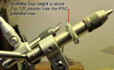 Note that the height of the vise is not that much of an issue, nor do I feel cramped, it is merely an environmental issue any tyer should be aware of as part of a pending purchase. Do you have the extra room on your desk for the pedestal, do you have the extra room for the six inch jaw offset (moving the vise to the left or right six inches), and does your tying include lots of long tools and materials hanging off the hook?