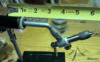 As the Excalibur is actually the shortest vise I own, using a long tube bobbin coupled with the shortness of the vise means you only have 3.5 inches of clearance under the bobbin when it’s at rest (see illustration above). This is plenty to tie flies, but if you do a lot of tying with dubbed loops, which are often longer than three inches, it means your dubbed loop and tool may need to rest on the table edge versus hanging vertically from the jaws.