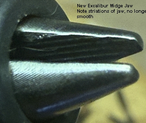 The Professional Midge jaw has a view striations on the vise jaw at the tip only. The Excalibur jaw is both sharper and thinner, but also has striations of metal the entire length of the jaw (see pictures)