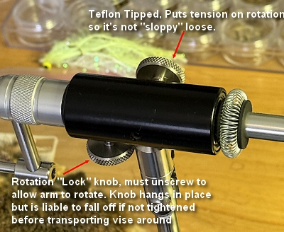 The problem is you have a loose screw that has gravity operating on it. If the screw loosens further with vise usage, and then you toss the vise in a backpack once the fly tying class is over, I can see this knob dropping out of the vise body, to be lost forever. Note: this knob is not dangerously loose when unscrewed into the “rotation unlock” position, it’s simply loose enough to wobble free over time, and under the right circumstances.