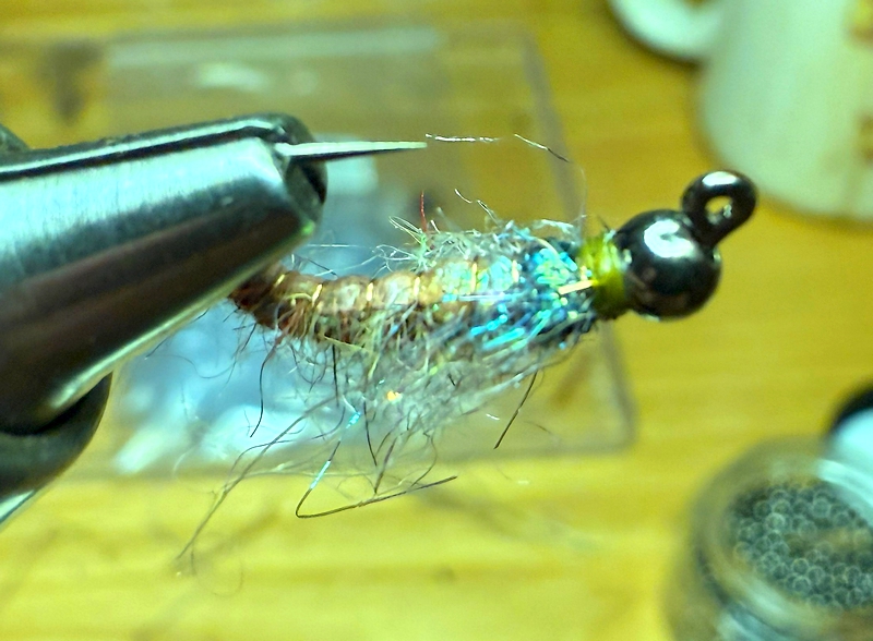 Cal’s Spectral Bird’s Nest is tied in the same fashion. The traditional Bird’s Nest blend is 10% natural baby seal, 45% Hare’s Mask, and 45% Australian Opossum. You can substitue white Firestar Antron for the Baby Seal, and then add a pinch of the Spectral blend to make the Spectral Bird’s Nest.